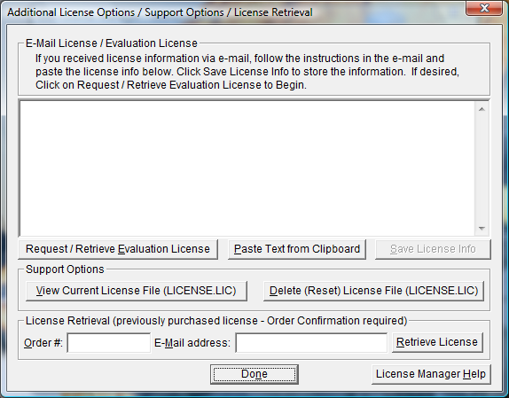 An Evaluation License sent via e-mail contains a block of text that has the license details for the License Manager. When sent via e-mail, the text can be copied and subsequently pasted into the text area here (Paste Text from Clipboard), then saved to enable (set) the License Information (Save License Info).